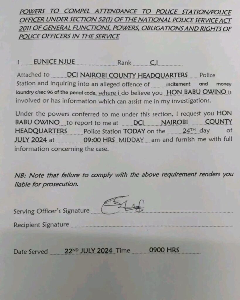 “I request you, Babu Owino, to report to me at the DCI headquarters, Nairobi County Police Station on July 24 at 09:00 hours and furnish me with full information concerning the case,” read part of the summon letter.